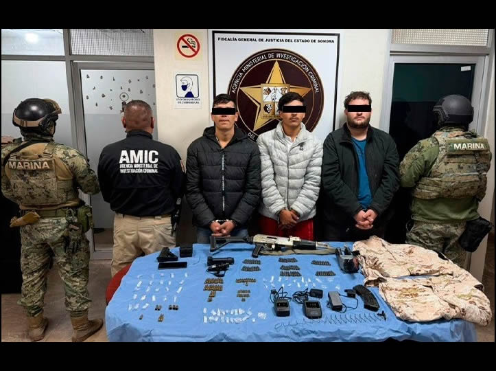 La Fiscalía General de Justicia del Estado de Sonora (FGJES), informó que durante las diligencias se detuvo a tres personas, se aseguraron armas, cargadores, equipo táctico, aparatos de comunicación y presunta droga, relacionados con actividades ilícitas.