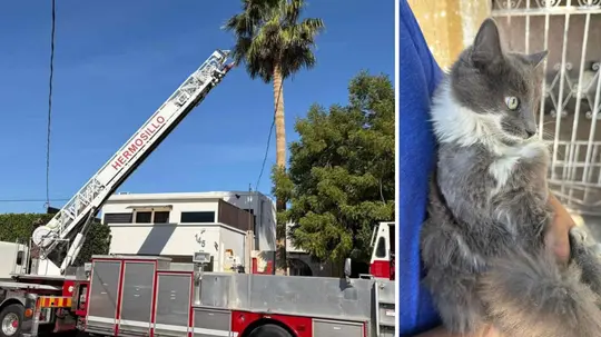 Elementos del cuerpo de Bomberos rescataron a un gato que terminó atrapado en una palmera sin posibilidades de bajar por sus propios medios en Hermosillo, Sonora.