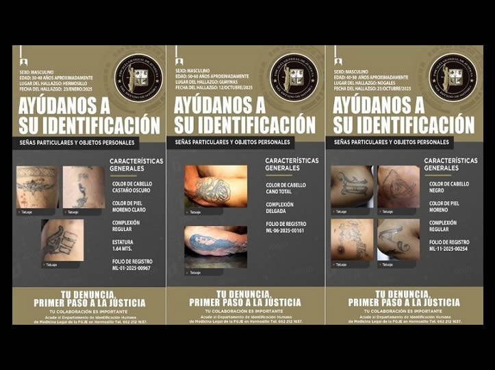 Hermosillo, Sonora.- La Fiscalía General de Justicia del Estado de Sonora informó que se cuentan con 15 nuevas cédulas de identificación forense de restos humanos localizados durante 2025 que se encuentran en calidad de desconocidos.