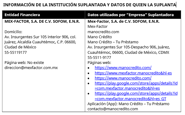 CIUDAD DE MÉXICO. – La Comisión Nacional para la Protección y Defensa de los Usuarios de Servicios Financieros (CONDUSEF) emitió una alerta urgente a la población ante la detección de un esquema de suplantación de identidad que afecta a la institución MEX-FACTOR, S.A. DE C.V. SOFOM E.N.R.