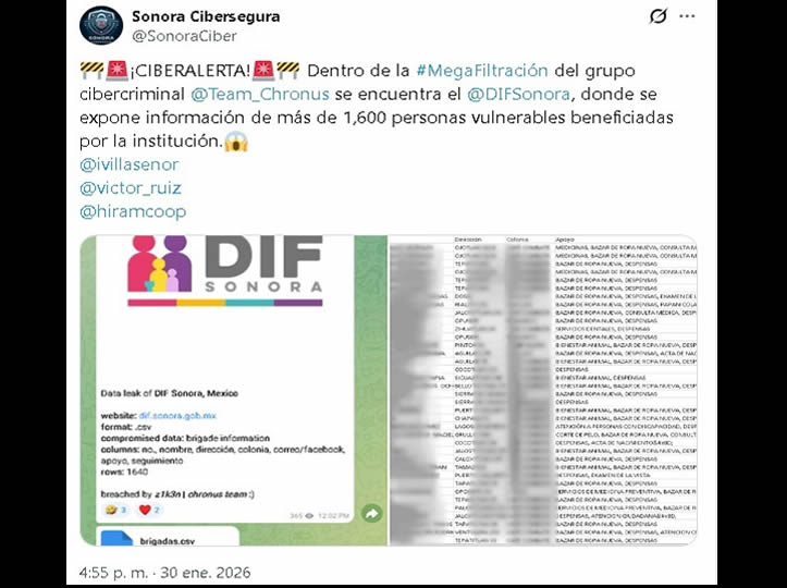 “Dentro de la Megafiltración del Grupo cibercriminal Team Chronus se encuentra DIF Sonora, donde se expone información de más de 1,600 personas vulnerables beneficiadas por la institución”, informó.