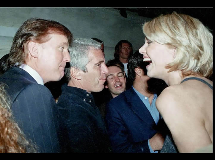 Donald Trump y Jeffrey Epstein miran a una mujer que ríe frente a ellos.
