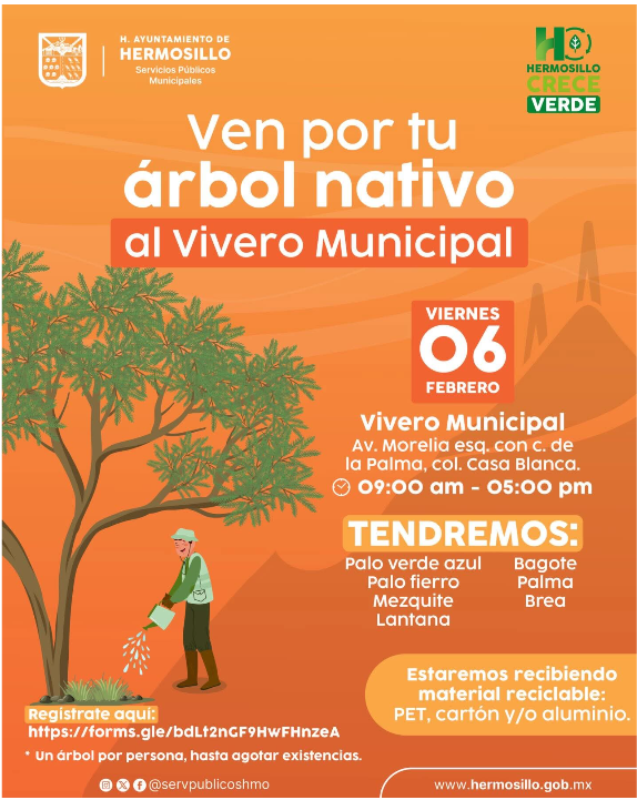 Hermosillo, Sonora; 4 de febrero, 2026.- Para fomentar la reforestación urbana y el cuidado del medio ambiente, el Ayuntamiento de Hermosillo, a través de Servicios Públicos Municipales y el programa Hermosillo Crece Verde, invita a la ciudadanía a participar en la entrega gratuita de árboles nativos en el Vivero Municipal.