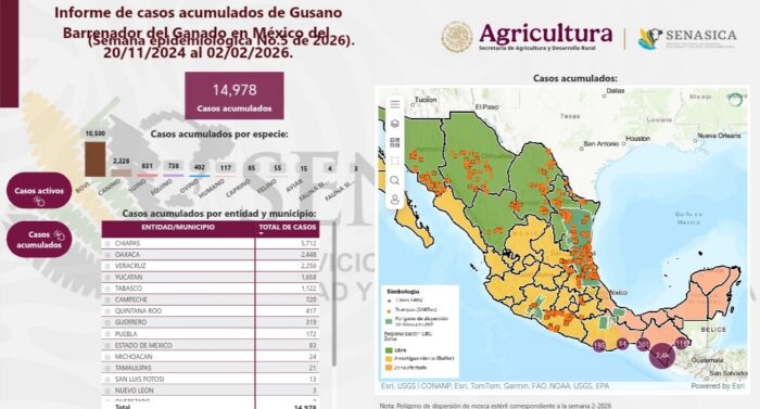 Desde el 20 de noviembre de 2024 al 2 de febrero de 2026, en México se han acumulado 14 mil 978 casos de gusano barrenador