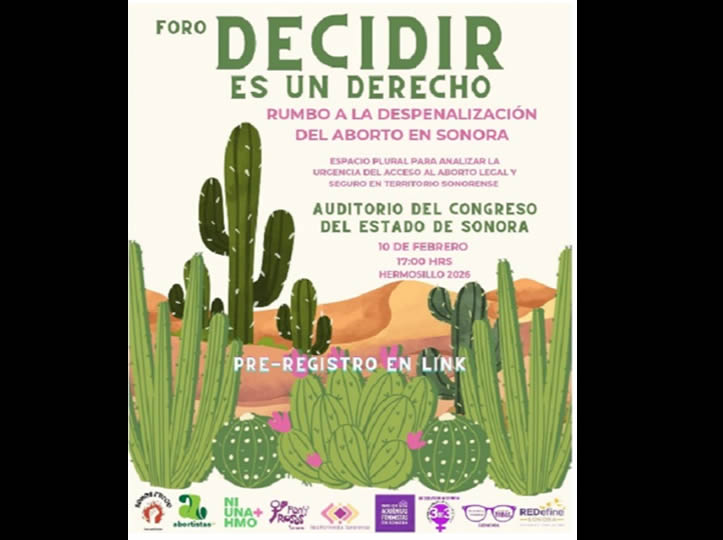 HERMOSILLO, Sonora.— Bajo la premisa de que la autonomía reproductiva no es un dilema moral, sino una urgencia de salud pública y justicia social, la Red de Colectivas por los Derechos Sexuales y Reproductivos en Sonora anunció la realización del foro “Decidir es un Derecho: rumbo a la despenalización del aborto en Sonora”.