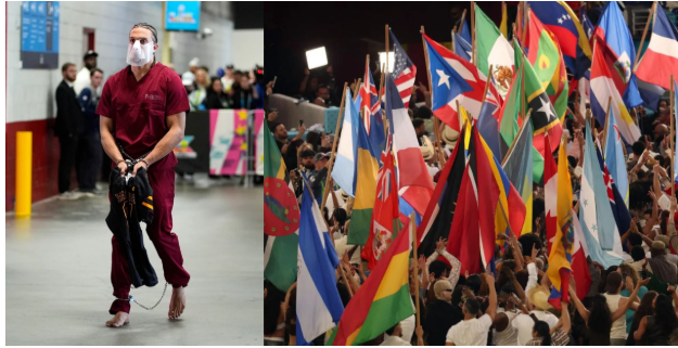 Y esos miles de millones vieron también al jugador de Patriotas Mark Hollins, llegando descalzo y esposado de manos y pies al estadio Levi’s, en una especie de performance para mostrar al mundo cómo trata el ICE a los migrantes.