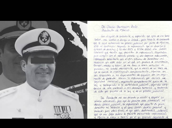 En la misiva, Farías Laguna señala que la Secretaría de Marina ha desobedecido resoluciones emitidas por una jueza los días 10 de noviembre de 2025 y 22 de enero de 2026, mediante las cuales se instruyó la entrega de información necesaria para la preparación de su defensa.