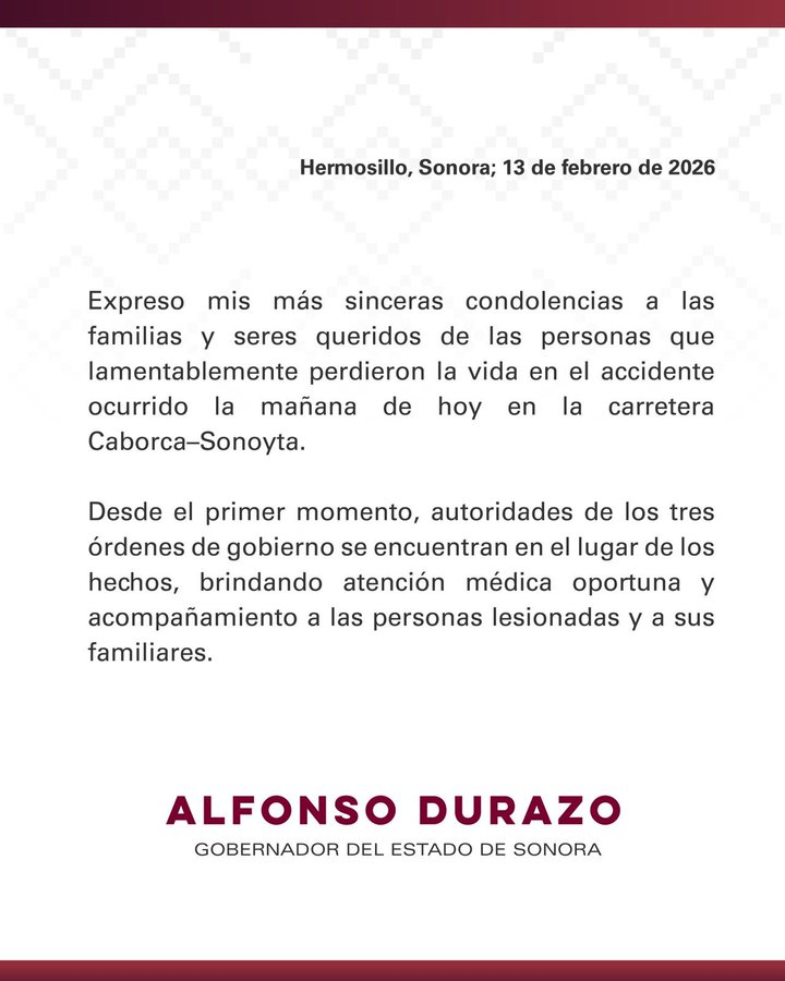 El gobernador de Sonora, Alfonso Durazo Montaño, manifestó en redes sociales sus condolencias a familiares de las víctimas del accidente de esta mañana en la carretera Caborca – Sonoyta. Informó que autoridades de los tres órdenes de gobierno se encuentran en el lugar del accidente.