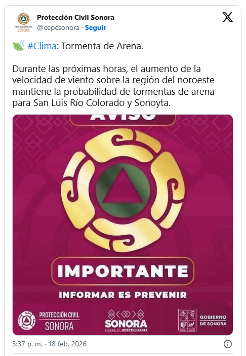 De acuerdo con el reporte más reciente de Protección Civil Sonora, el aumento del viento mantiene la probabilidad de tormentas de arena en el estado, con rachas superiores a los 70 kilómetros por hora (km/h) que impactarán San Luis Río Colorado y Sonoyta.