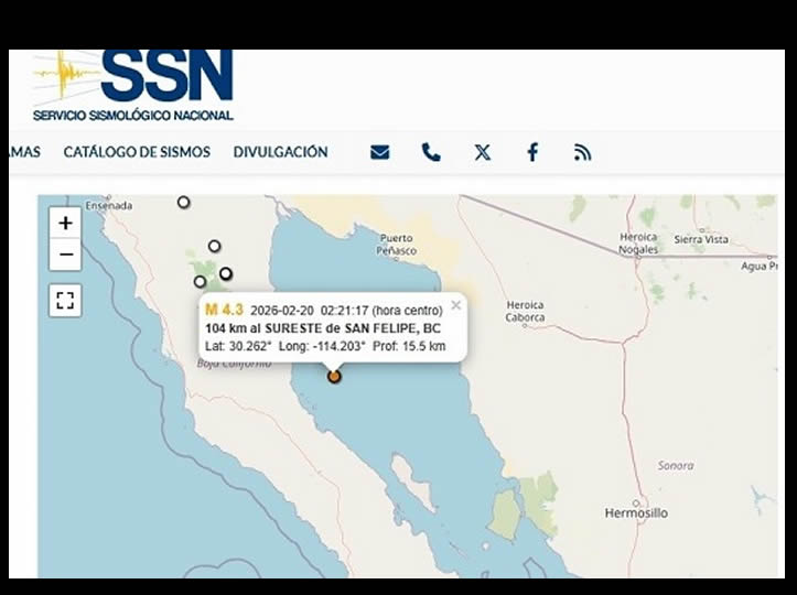 “En las últimas horas se reportaron varios sismos en la región, uno de ellos de magnitud 4.3, 104 kilómetros al suroeste de San Felipe, Baja California, a una profundidad de 15.5 kilómetros”.