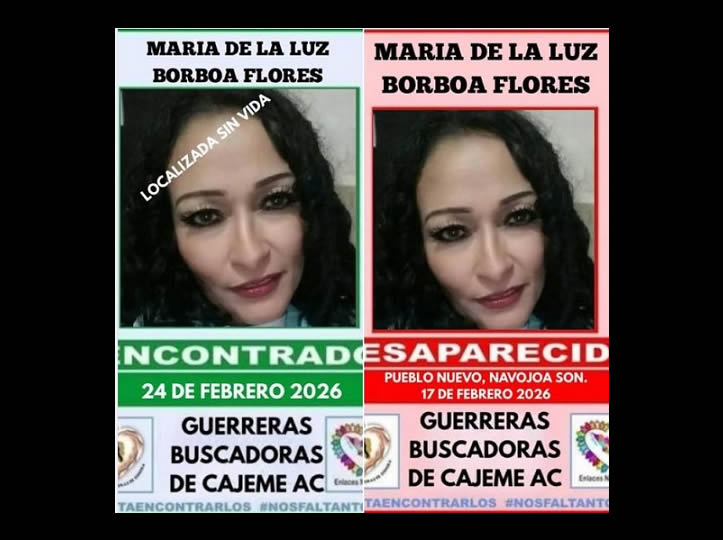 Hermosillo, Sonora.- El Colectivo Guerreras Buscadoras Cajeme AC, informó este miércoles que fue localizado el cuerpo sin vida de María de la Luz Borboa Flores.