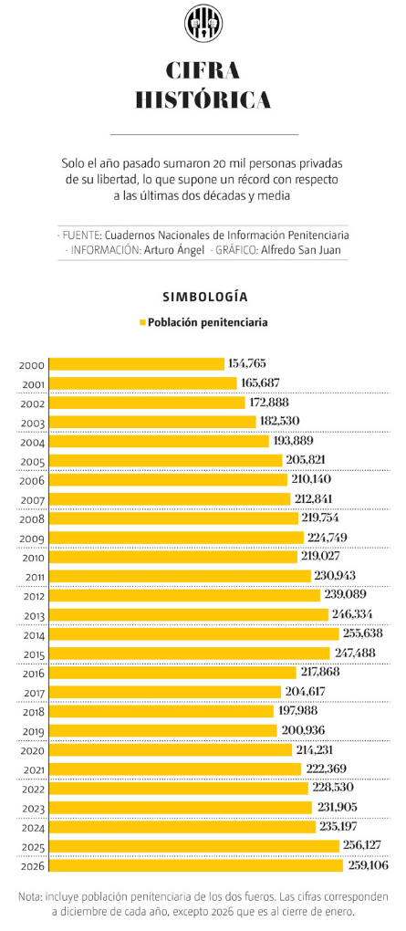 La cifra de encarcelados en México alcanzó en enero un nivel histórico: casi 260 mil personas privadas de su libertad en alguno de los 276 centros penitenciarios del país, la más alta en 26 años. Tan solo en 2025, la población en esta situación creció en más de 20 mil internos, otro récord.