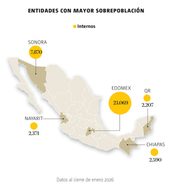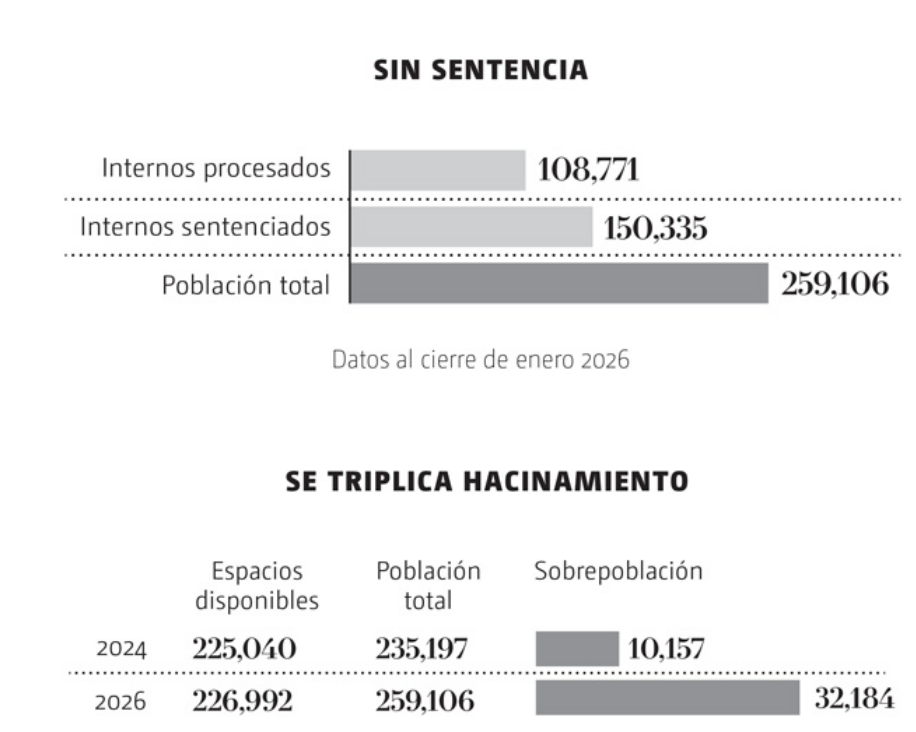 Dos años después el problema se ha triplicado. Para enero de este 2026, aunque la capacidad de camas en las cárceles ha subido a 226 mil 922, la población penitenciaria como ya se dijo, roza los 260 mil. En números cerrados, es una sobrepoblación total nacional de 32 mil 84 personas más.