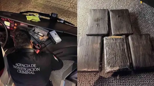 Durante la revisión, las autoridades localizaron cinco paquetes rectangulares que contenían fentanilo, con un peso bruto aproximado de 5.6 kilogramos, además de tres teléfonos celulares y un kit de herramientas.