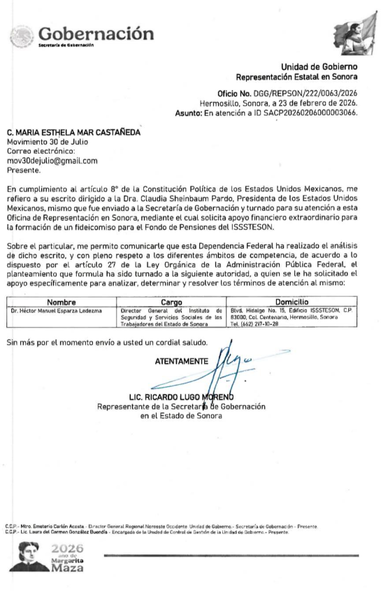 HERMOSILLO, SONORA. – En lo que representa un hito para la lucha social en el estado, el Movimiento 30 de Julio confirmó que el Gobierno Federal ha tomado cartas en el asunto sobre la crisis financiera que atraviesa el Isssteson. La Secretaría de Gobernación (Segob) respondió formalmente a la petición entregada directamente a la presidenta Claudia Sheinbaum para la creación de un fideicomiso por 15 mil millones de pesos (MMP).