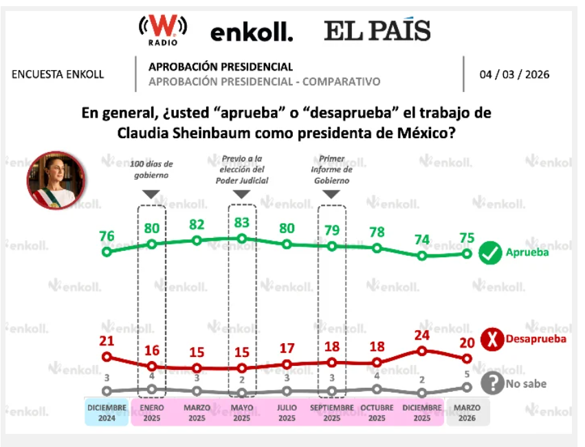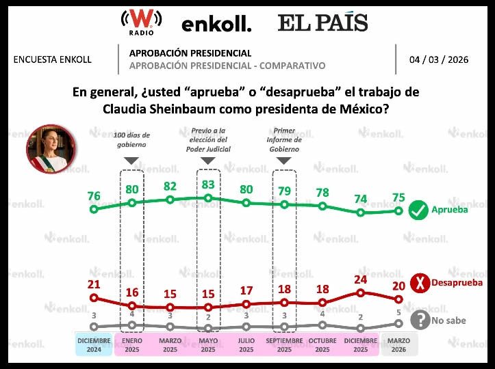 Tras el abatimiento del principal líder del Cártel Jalisco Nueva Generación (CJNG), la encuesta más reciente de Enkoll ubicó a la Presidenta Claudia Sheinbaum con un 75 por ciento de aprobación en marzo, siete puntos por debajo de lo que registró en el mismo mes del año pasado, pero un nivel muy similar al que tenía en diciembre de 2024, de 76 por ciento.