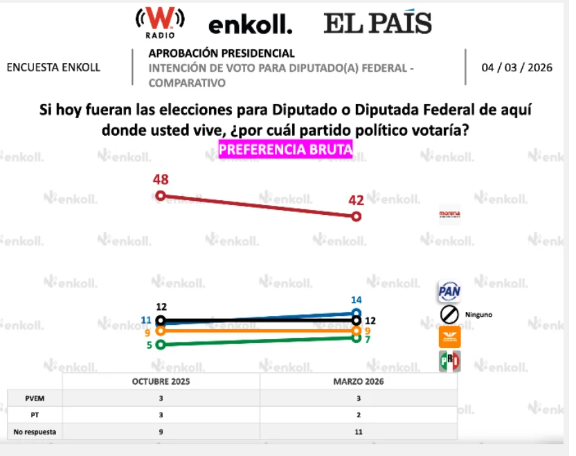 Enkoll muestra una caída de seis puntos en la preferencia de ese partido para la elección de diputados federales, al pasar de 48 a 42 por ciento entre octubre de 2025 y marzo de este año.