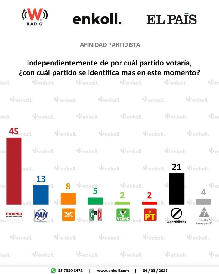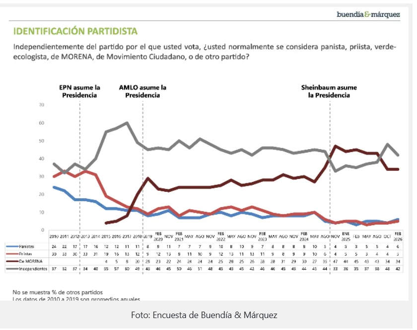 En febrero pasado esa encuestadora indicó que la proporción de personas que se considera de Morena se ubicó entonces en 34 por ciento, por debajo del 45 por ciento reportado en febrero de 2025.