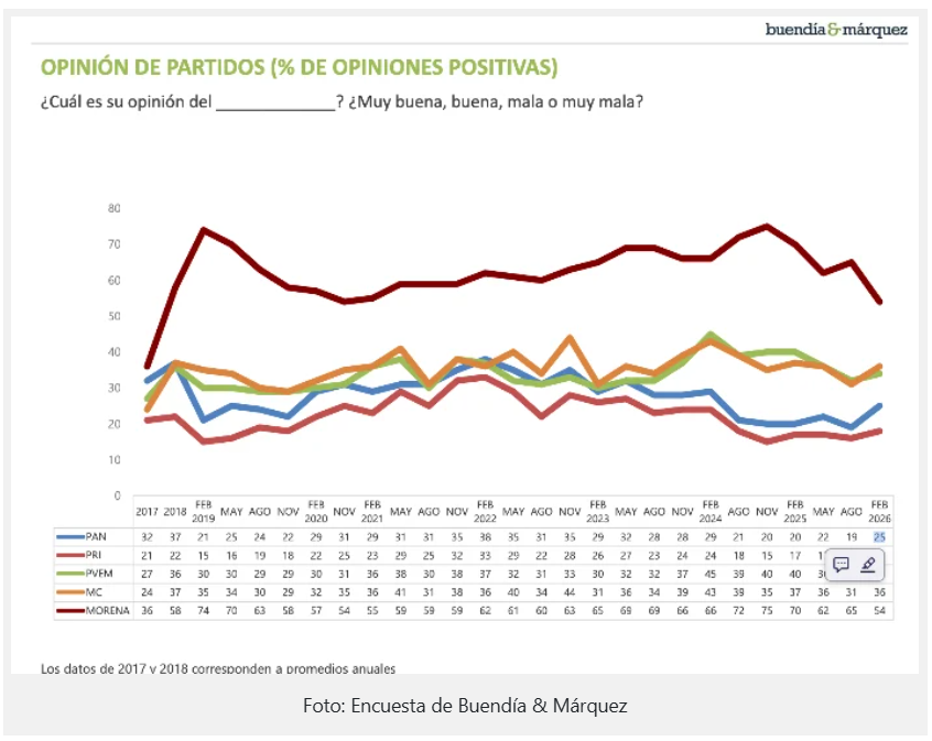 “La brecha entre Morena y el resto sigue siendo amplia, aunque en la serie histórica la opinión positiva de Morena cae de 70 por ciento en febrero de 2025 a 54 por ciento en febrero de 2026”, agregó.