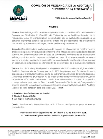 Este martes 10 de marzo, la Comisión de Vigilancia de la Auditoría Superior de la Federación (ASF) de la Cámara de Diputados dio a conocer la terna de candidatos que competirá por dirigir el principal órgano fiscalizador del país durante el período 2026-2034.
