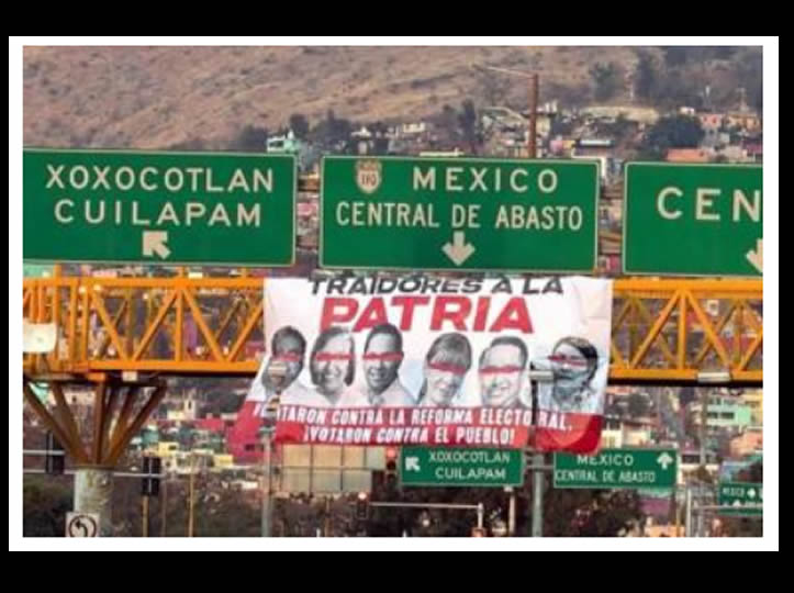 Las fotografías de seis diputados federales del Partido del Trabajo, designados por la vía plurinominal fueron exhibidos en sendas lonas, en distintos puntos de la capital de Oaxaca, con la leyenda “ Traidores a la Patria”, en referencia a la votación de la reforma electoral, discutida en fecha reciente en la Cámara de Diputados.