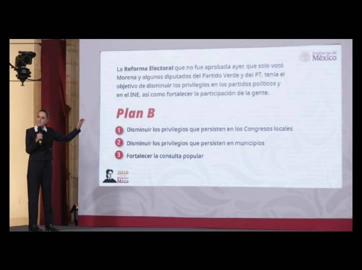 CIUDAD DE MÉXICO (apro).- La presidenta Claudia Sheinbaum presentó su Plan B luego del rechazo a la iniciativa de la reforma electoral: disminución de gastos en congresos locales y regidurías; así como el reforzamiento de consultas populares sobre asuntos en esta materia.