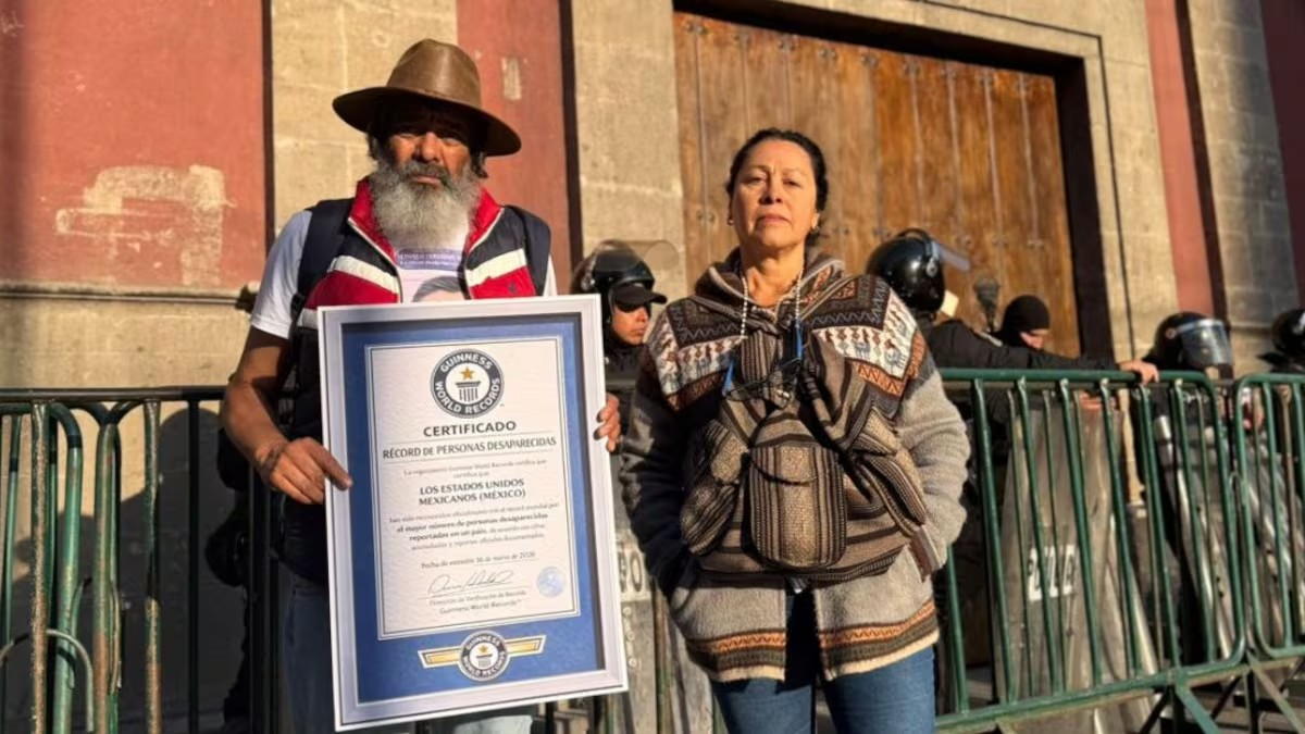 Los familiares de personas desaparecidas acudieron a las inmediaciones de la llamada “mañanera del pueblo” con un certificado simbólico inspirado en los reconocimientos de Guinness World Records, con el objetivo de visibilizar la crisis de desapariciones en el país.