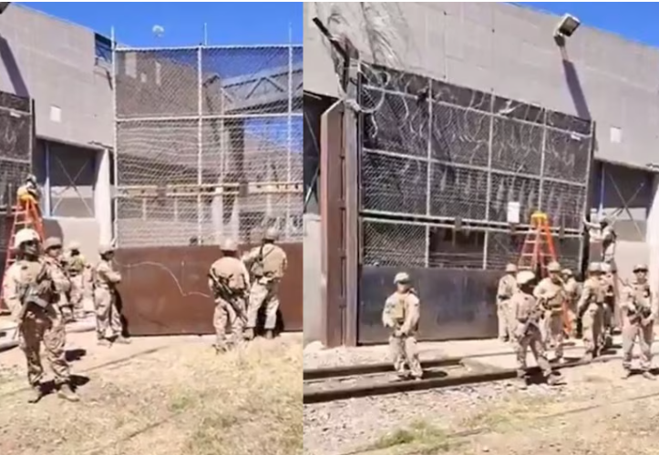 El reportero captó en video el momento en el que los militares estadounidenses realizaban los trabajos en la puerta que cubre el paso del tren, en el que se les observó con dos escaleras.