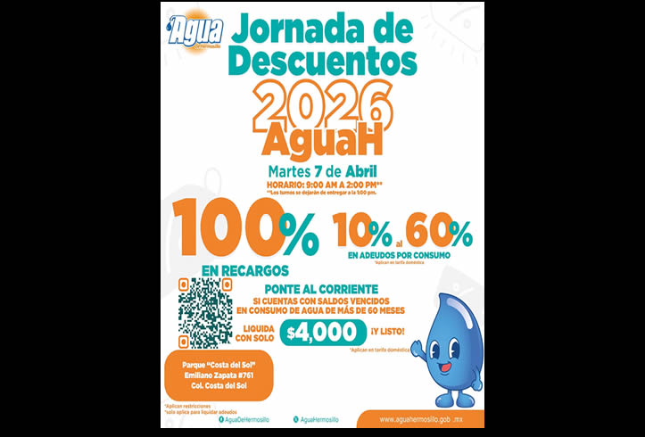 Hermosillo, Sonora; 6 de abril, 2026.-* Este martes 7 de abril de 9:00 a 14:00 horas se llevará a cabo la Jornada de Descuentos que impulsa Agua de Hermosillo en las instalaciones del parque ubicado en calle Emiliano Zapata número 761 en la colonia Costa del Sol, para las y los usuarios que deseen ponerse al corriente en sus pagos.