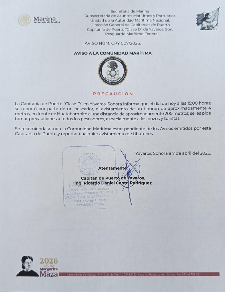 Autoridades del municipio de Huatabampo emitieron una alerta por avistamiento de un tiburón de cuatro metros frente a las costas del puerto de Yavaros, Sonora.