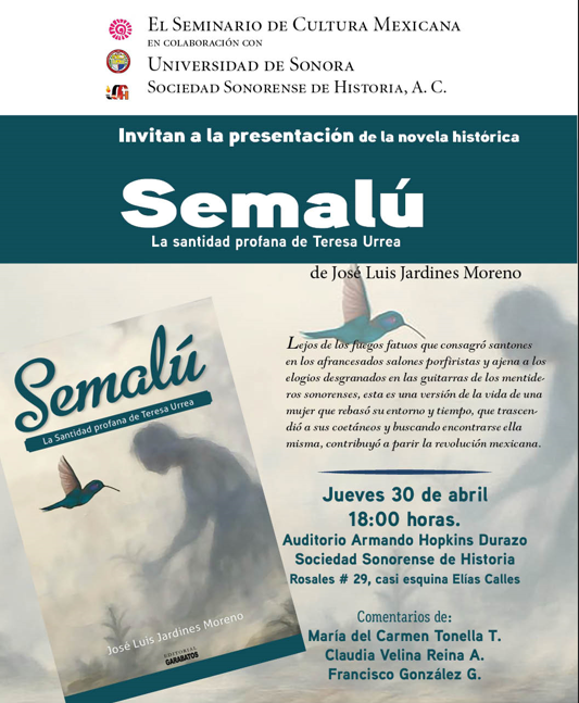 HERMOSILLO, SONORA.— En un esfuerzo conjunto por rescatar la memoria histórica y literaria de la región, el Seminario de Cultura Mexicana, la Universidad de Sonora y la Sociedad Sonorense de Historia invitan a la comunidad a la presentación de la novela histórica Semalú: La santidad profana de Teresa Urrea, del autor José Luis Jardines Moreno.