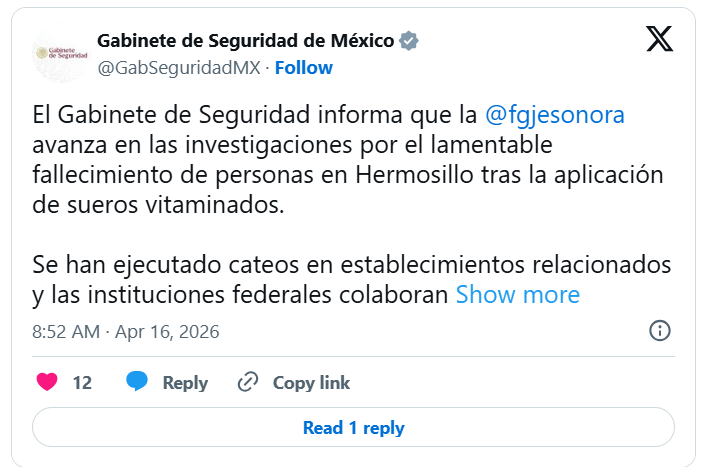 “El Gabinete de Seguridad informa que la @fgjesonora avanza en las investigaciones por el lamentable fallecimiento de personas en Hermosillo tras la aplicación de sueros vitaminados”, señaló.