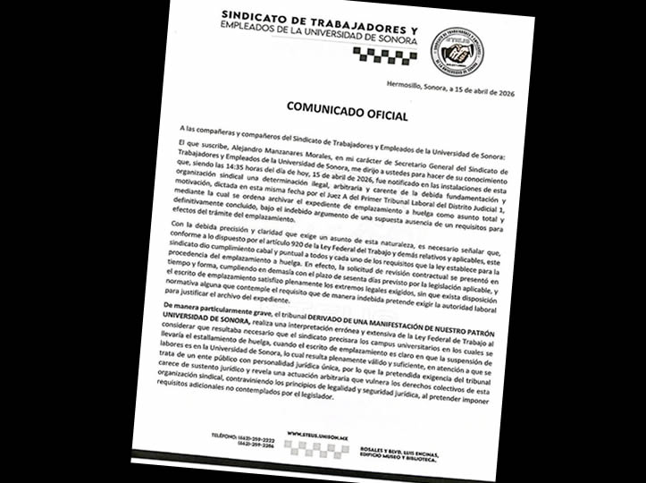 HERMOSILLO, Sonora – El Sindicato de Trabajadores y Empleados de la Universidad de Sonora (STEUS) informó este 15 de abril que el Primer Tribunal Laboral del Distrito Judicial 1 ordenó el archivo definitivo del expediente de emplazamiento a huelga de la organización. La notificación, recibida a las 14:35 horas, establece el cierre del caso bajo el argumento de incumplimiento de requisitos en el trámite procesal.