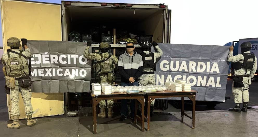 El conductor de un tractocamión fue detenido en Sonora luego de que autoridades localizaran un cargamento de cocaína, cristal y goma de opio oculto en un doble fondo de la caja refrigerada de la unidad que transportaba cajas con verdura.