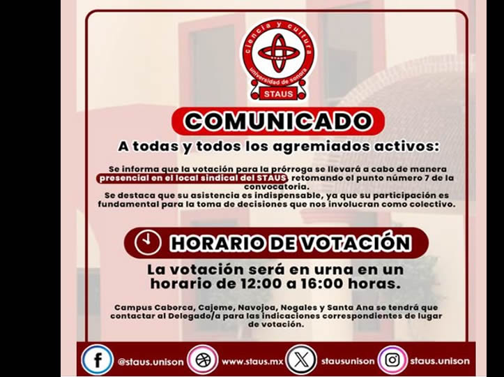 Hermosillo, Sonora.- El Sindicato de Trabajadores Académicos de la Universidad de Sonora lleva a cabo este miércoles 29 de abril una Asamblea General Extraordinaria para votar una propuesta de prorrogar hasta el 14 de mayo el posible estallamiento a huelga